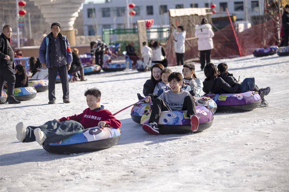 2月19日,河北省邯郸市复兴区二六七二街道东高河村滑雪场,游客在滑道用雪圈游玩,体验冰雪运动带来的快乐。聂长青摄