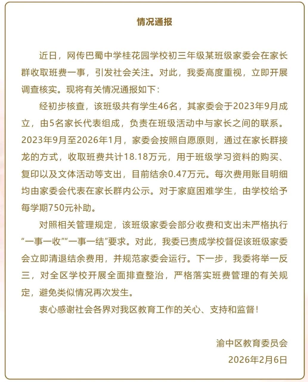 近日,网传巴蜀中学桂花园学校初三年级某班级家委会在家长群收取班费一事,引发社会关注。对此,我委高度重视,立即开展调查核实。现将有关情况通报如下: