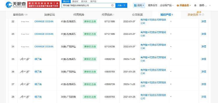 与此同时,天眼查App显示,橘子海乐队张坤明已申请注册多枚“橘子海”相关商标,国际分类涉及灯具空调、家具、教育娱乐等,当前部分商标已注册成功。此外,“橘子海”已被多方申请注册为商标,申请人包括酉阳县某装饰城、南昌某科技有限公司等,国际分类涉及餐饮住宿、通讯服务等,当前商标状态多为已注册。
