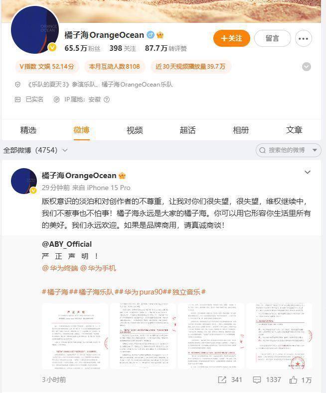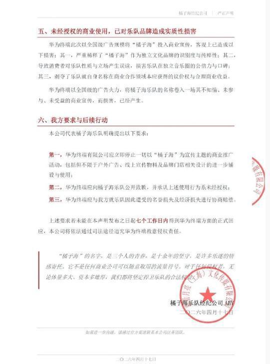 橘子海乐队经纪公司的这份公开《严正声明》称,近日,华为终端就其旗舰产品Pura 90系列手机开展大规模商业推广活动,将“橘子海”作为该系列主推配色的核心品牌概念,配以“看惯了人山人海,就去看橘子海”“一起去看橘子海”等宣传语,在多个自媒体平台、全国多地核心商圈、地铁站点、户外大屏同步铺设。与此同时,华为终端更以“橘子海”主题对旗下品牌门店进行整体改造,将“橘子海”概念的商业使用规模扩张至线下实体空间。以上行为,严重侵犯了橘子海乐队的合法权益。